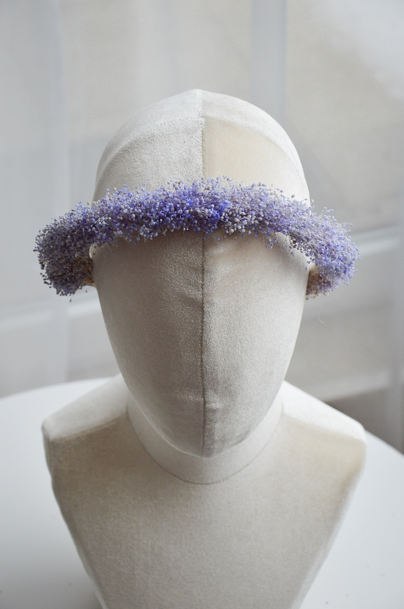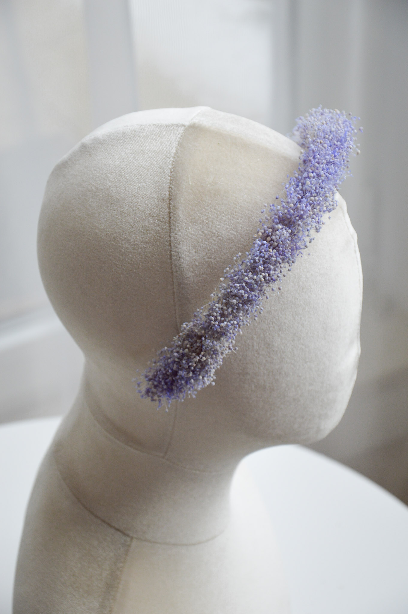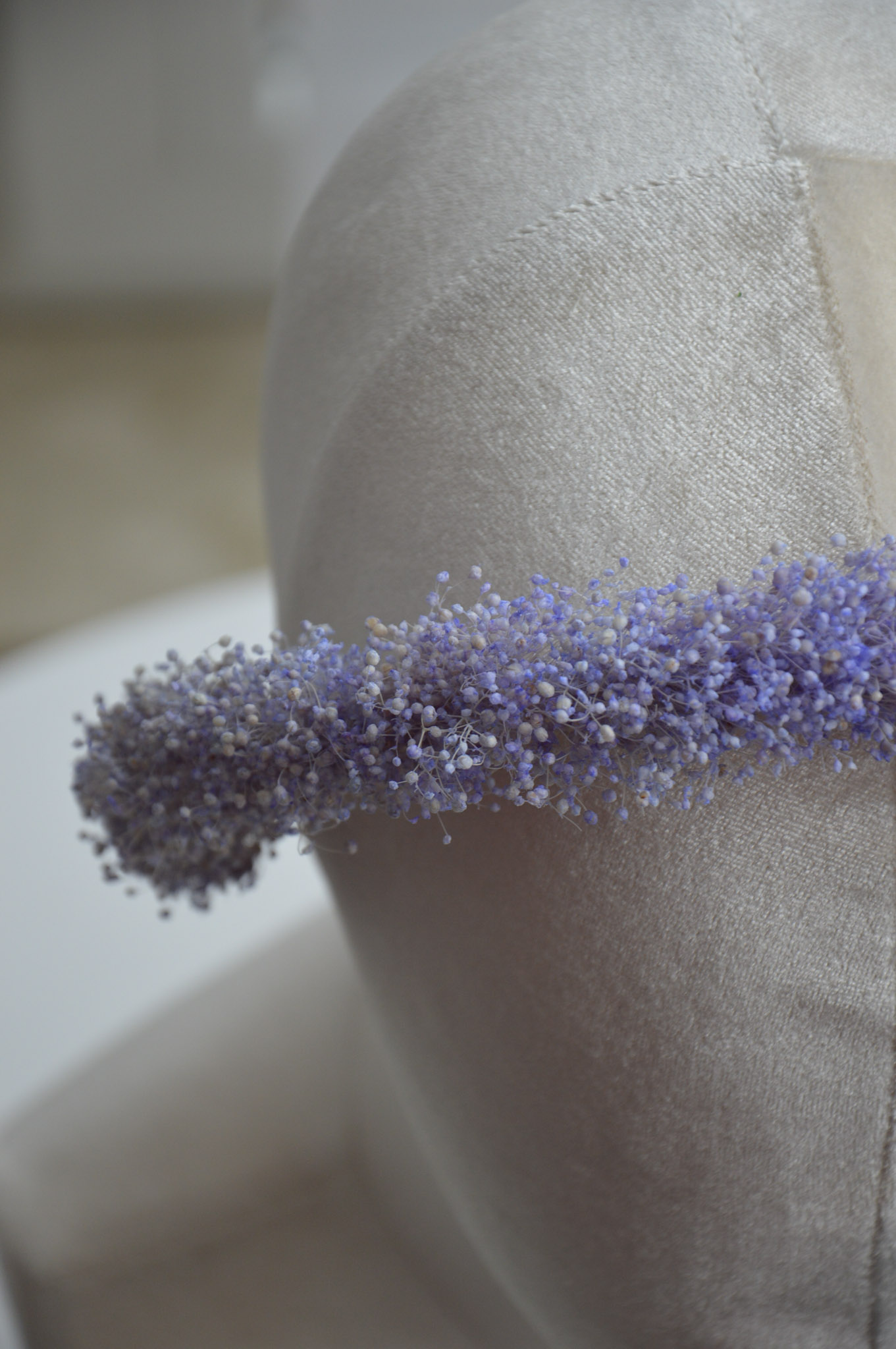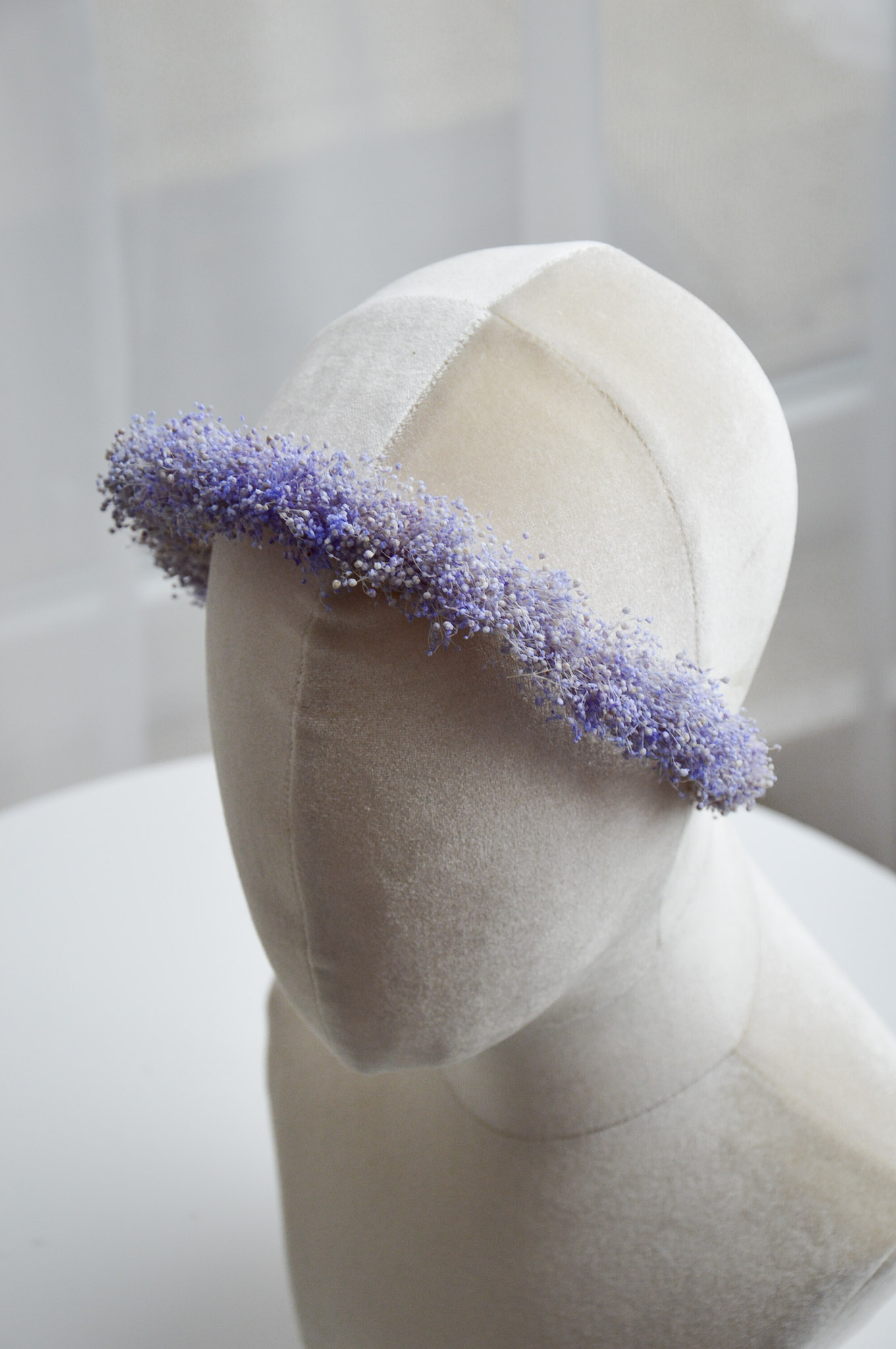 Ręcznie robiona opaska z naturalnej, konserwowanej gipsówki w subtelnym, fioletowym odcieniu. Lekka, wygodna i idealna na ślub, Komunię, sesję zdjęciową oraz letnie przyjęcia w stylu boho.