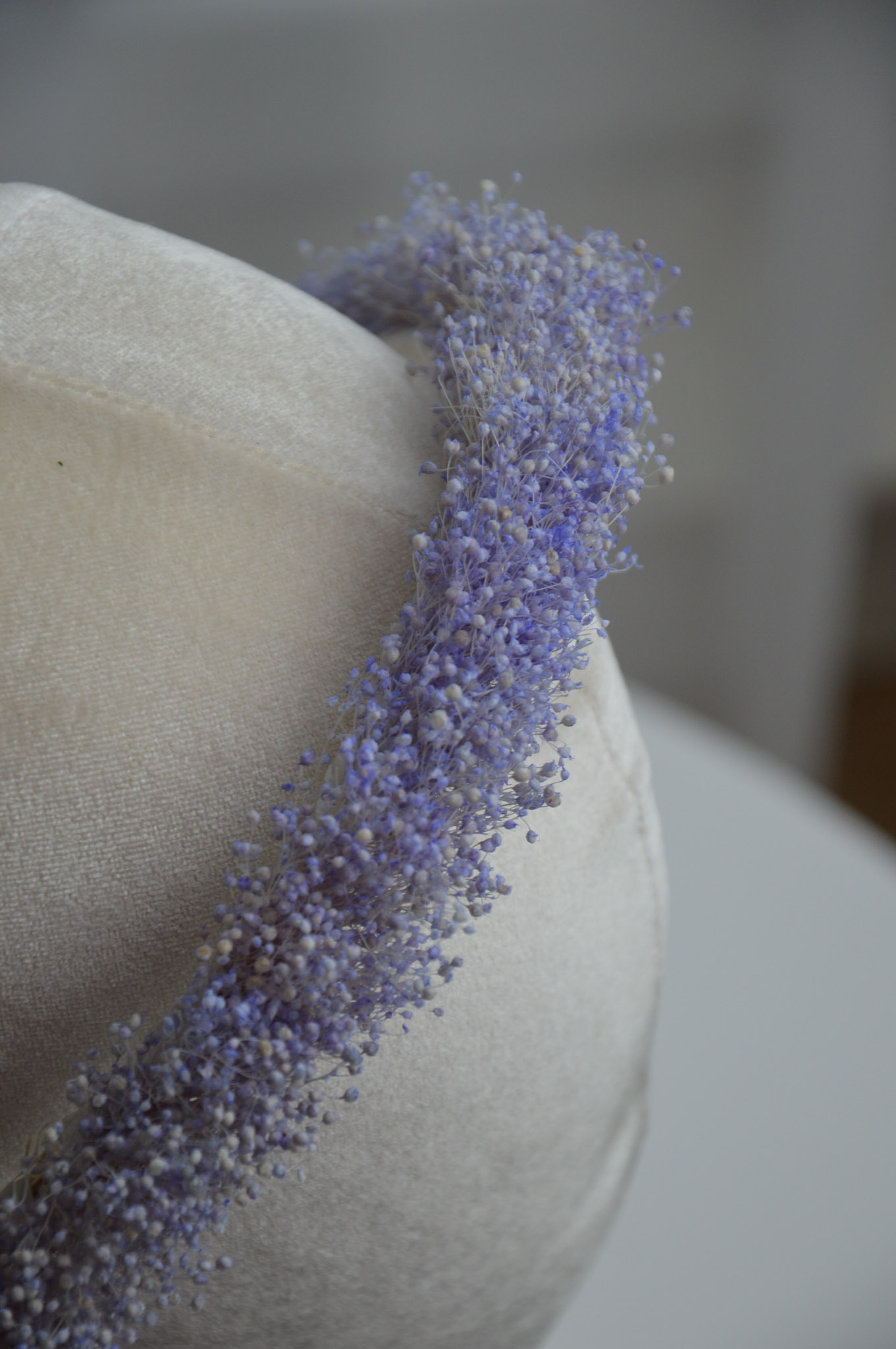 Delikatna opaska z naturalnej, konserwowanej gipsówki w subtelnym odcieniu fioletu to lekki i romantyczny dodatek do włosów w stylu boho. Zwiewna forma oraz drobne kwiaty tworzą niezwykle subtelną kompozycję, która pięknie podkreśla naturalne piękno i nie dominuje stylizacji.