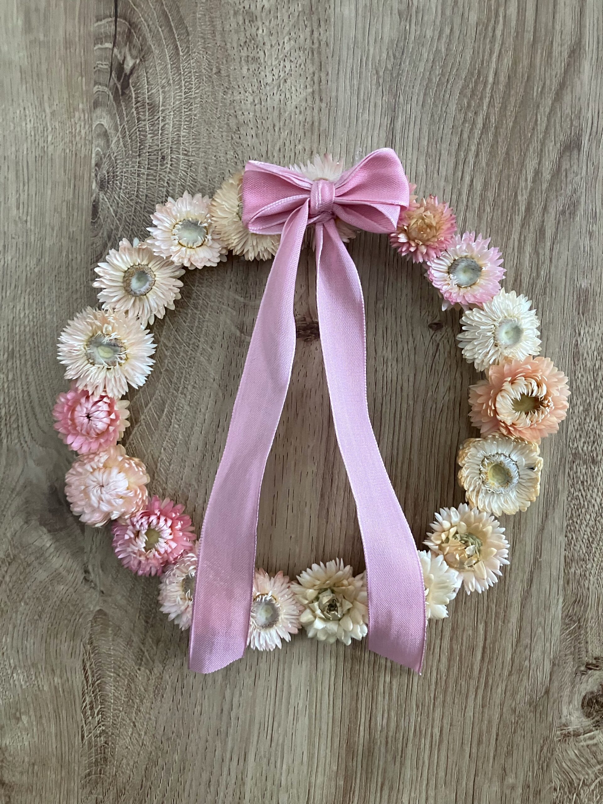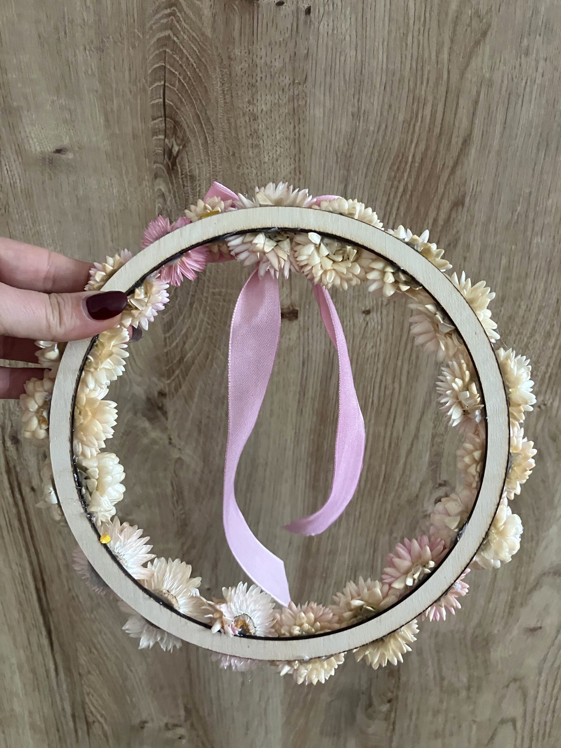 Naturalny wianek z suszonych kwiatów w odcieniach kremu i pudrowego różu. Romantyczna dekoracja domu i piękny prezent na Dzień Babci, urodziny czy imieniny.