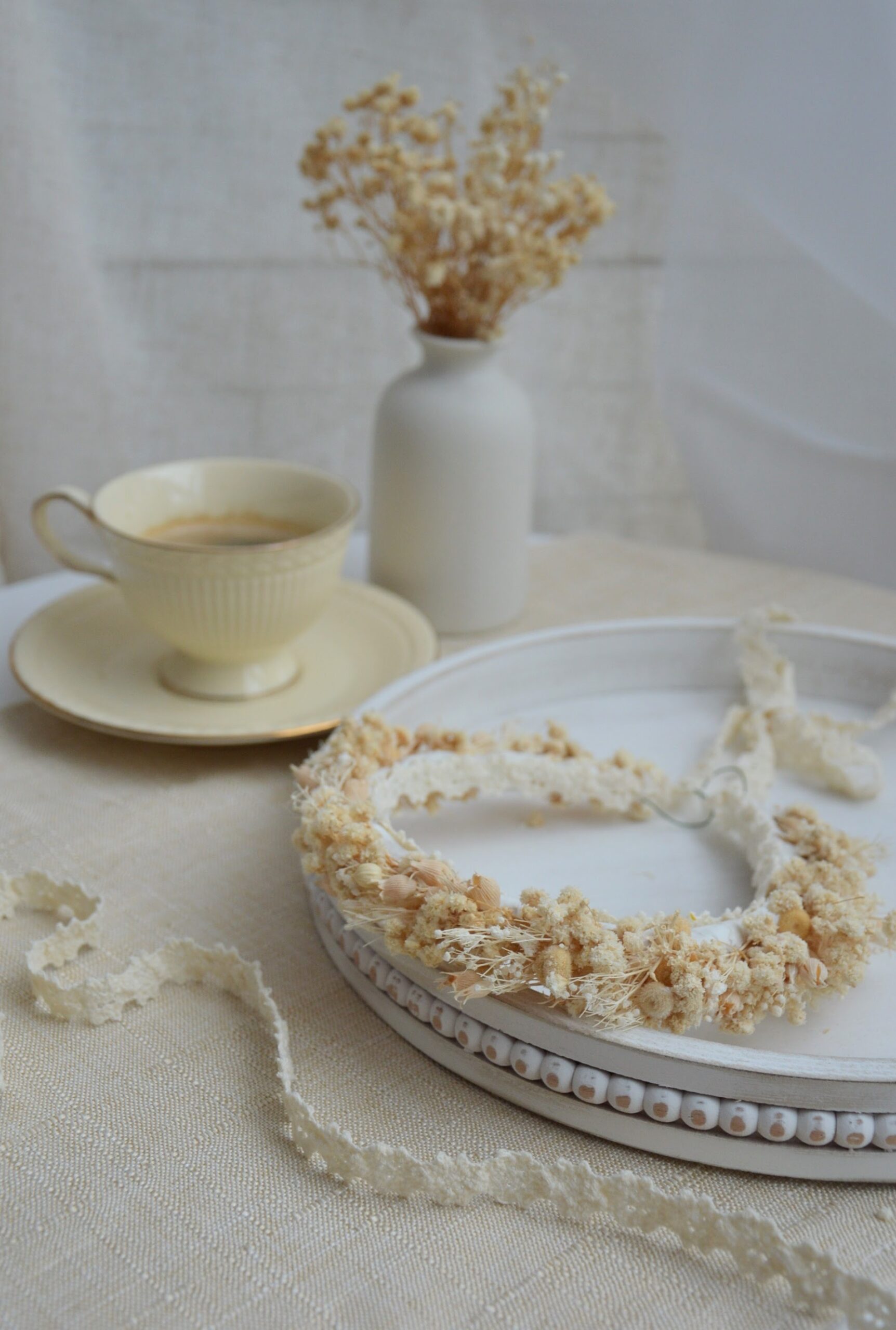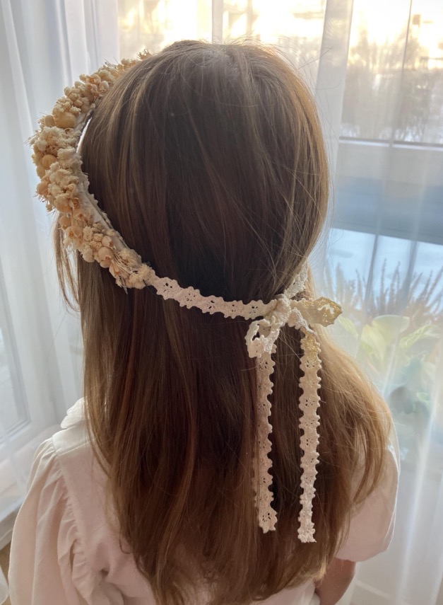 Delikatny i elegancki wianek komunijny wykonany z wysokiej jakości stabilizowanych kwiatów w subtelnym, kremowym odcieniu. Idealny dodatek do stroju komunijnego – naturalny, lekki i ponadczasowy.