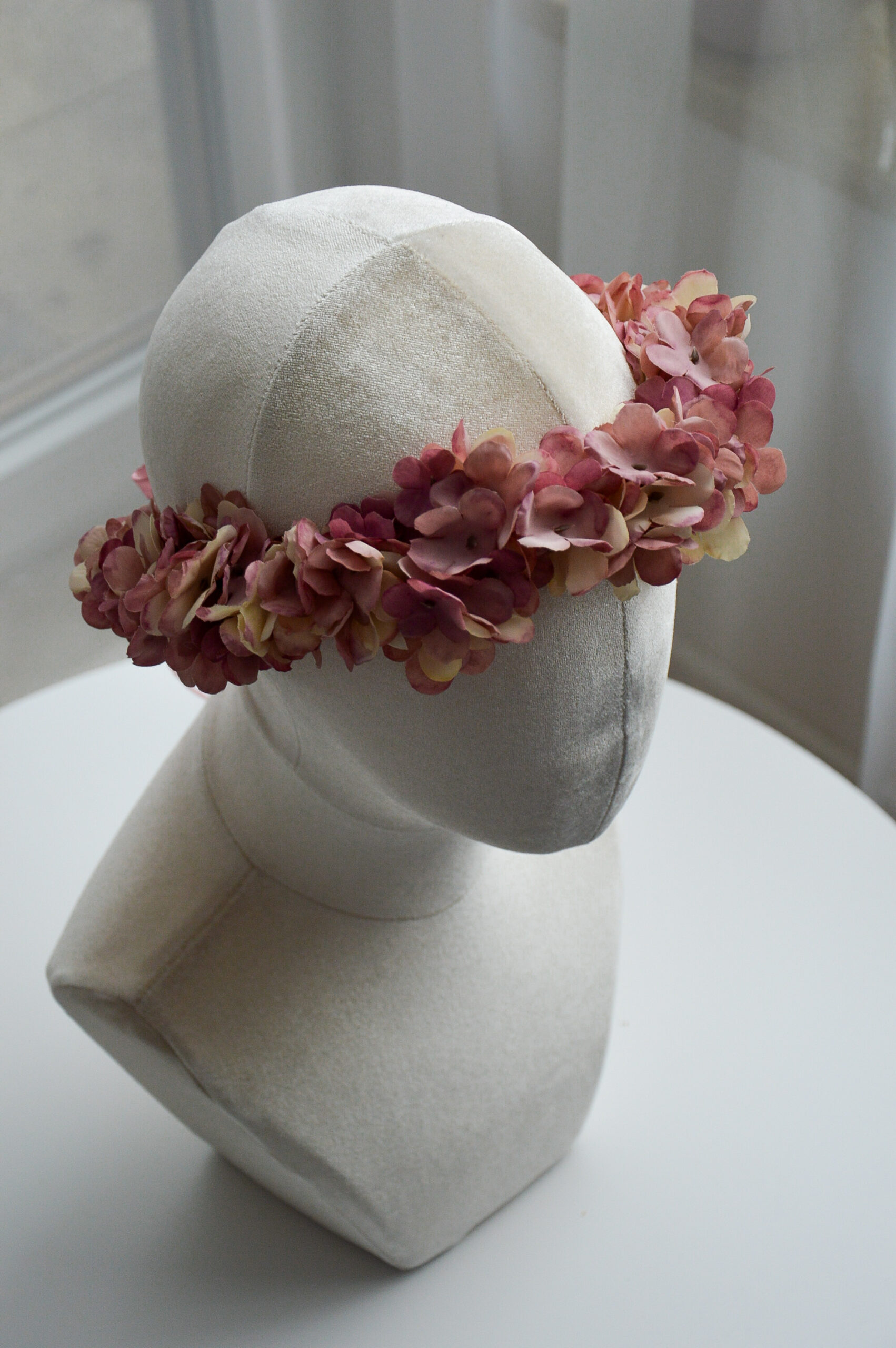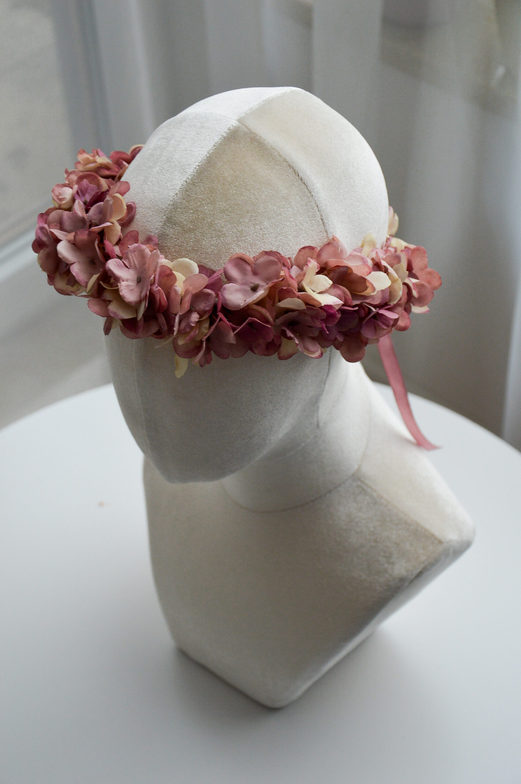 Delikatny wianek kwiatowy na głowę – różowa hortensja