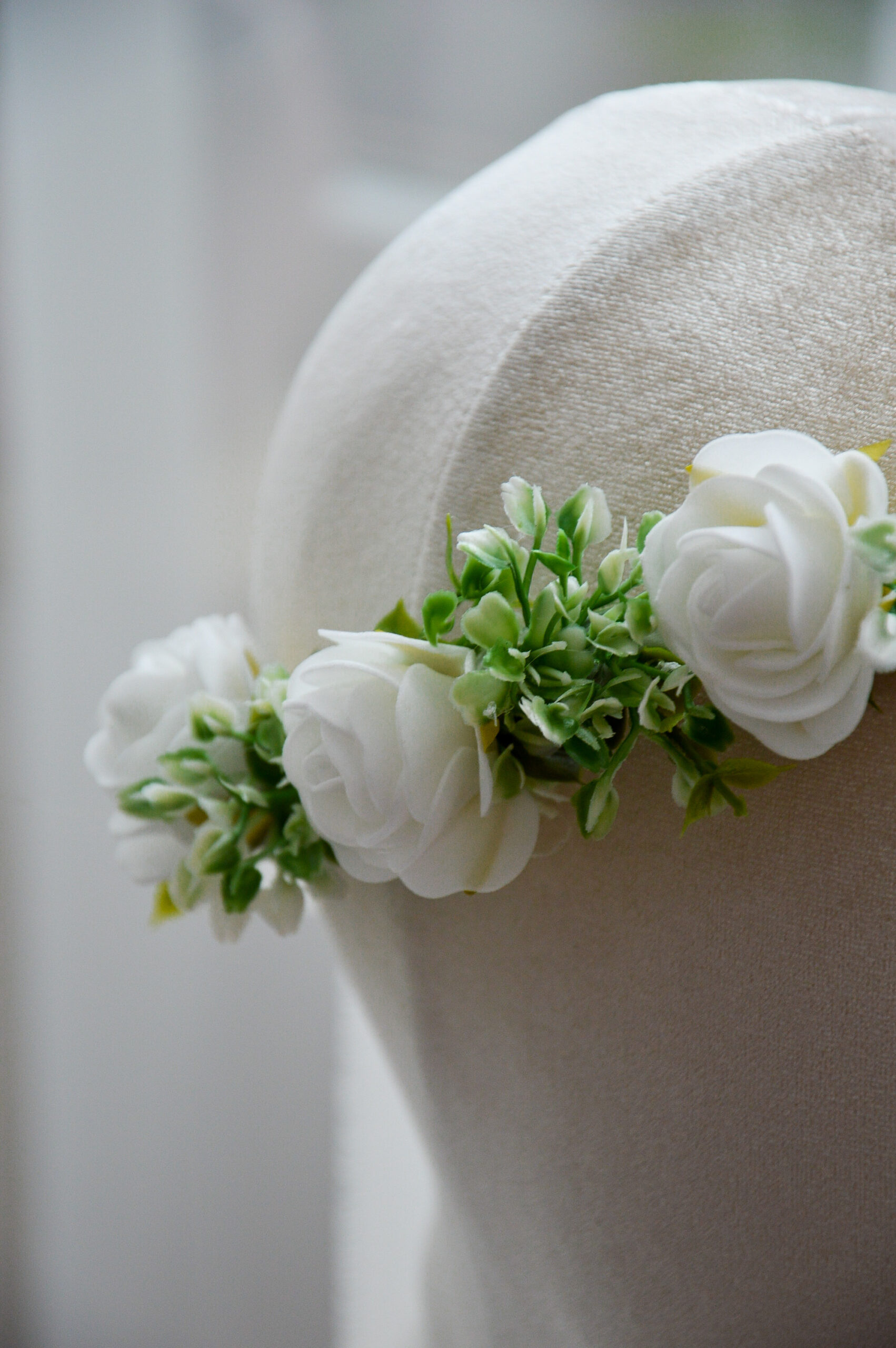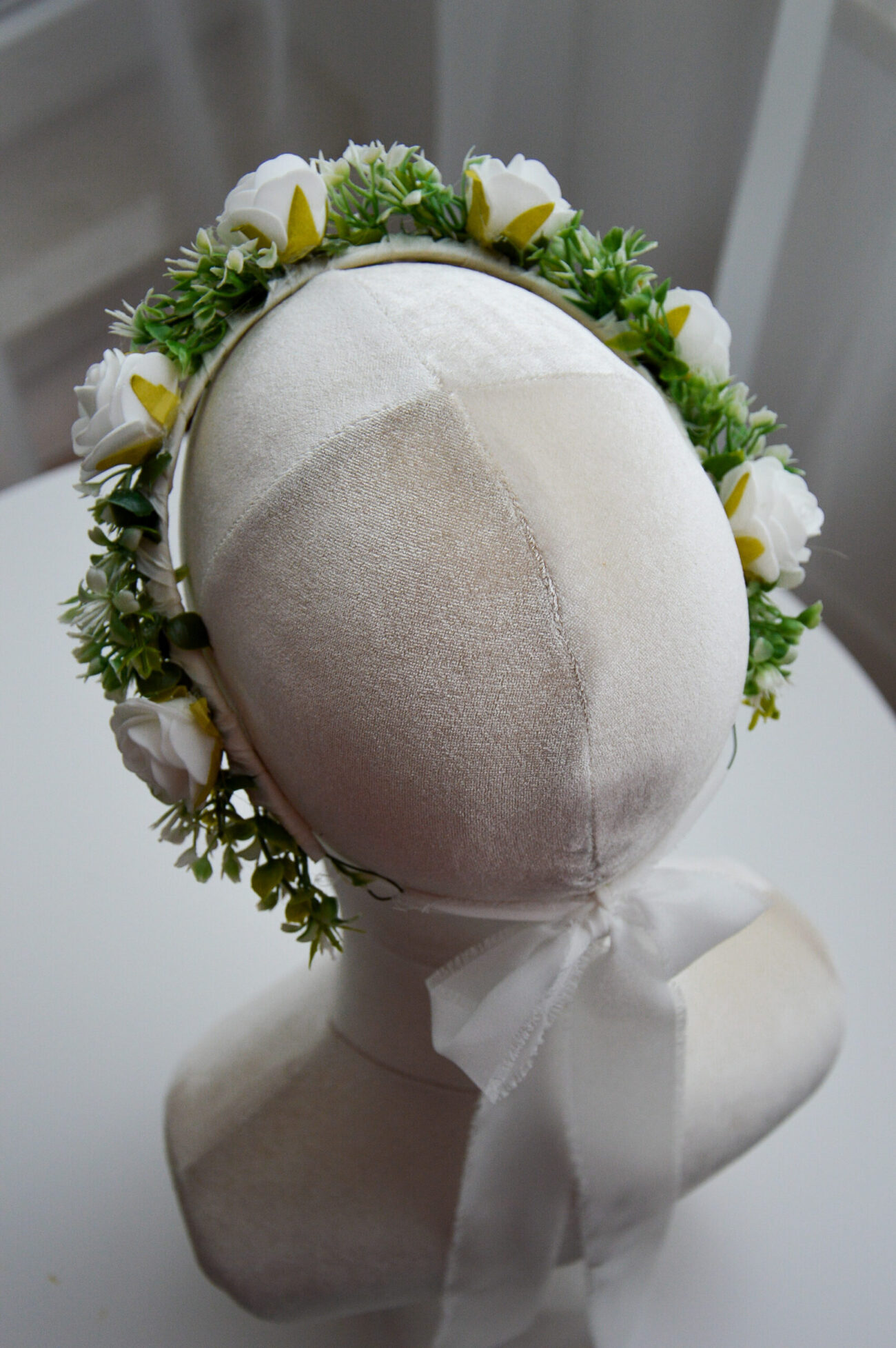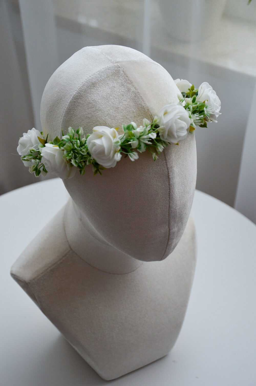 Delikatny wianek na głowę z białych kwiatów i zieleni. Idealny na Pierwszą Komunię Świętą, ślub, wesele i sesje zdjęciowe. Lekka, elegancka ozdoba do włosów.