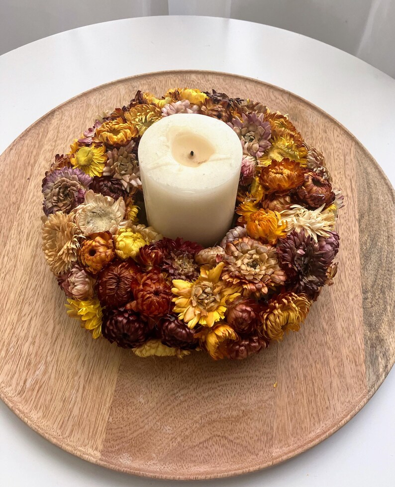 Wianek został ułożony na solidnej, lekkiej bazie ze styropianu i ozdobiony wysokiej jakości suszonymi kwiatami kocanki. Połączenie głębokich, ciepłych kolorów z kremowymi akcentami tworzy przytulną, romantyczną kompozycję, która doskonale pasuje do wielu aranżacji wnętrz.